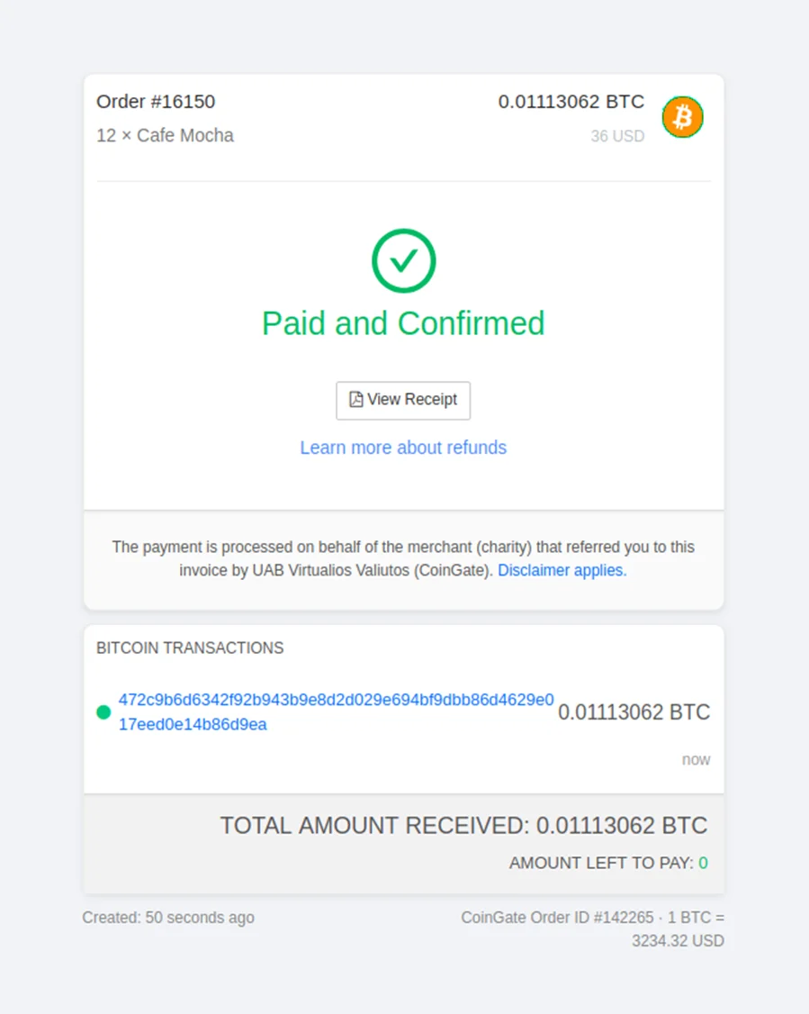 После того, как отправите транзакцию, сразу увидите сообщение с подтверждением.