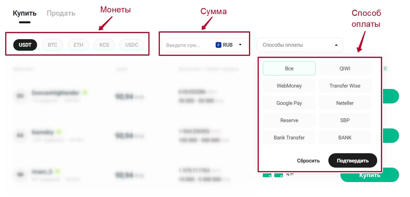 На KuCoin можно купить цифровой доллар, Bitcoin, Ethereum и внутренний токен биржи. Потом их можно обменять на другие монеты, если нужно.