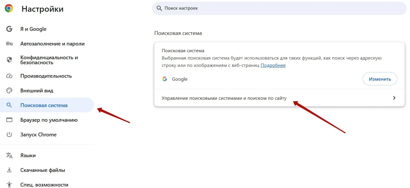 Шаг 1. Откройте настройки Chrome и найдите раздел «Поисковая система». Затем нажмите «Управление поисковыми системами и сайтами для поиска».