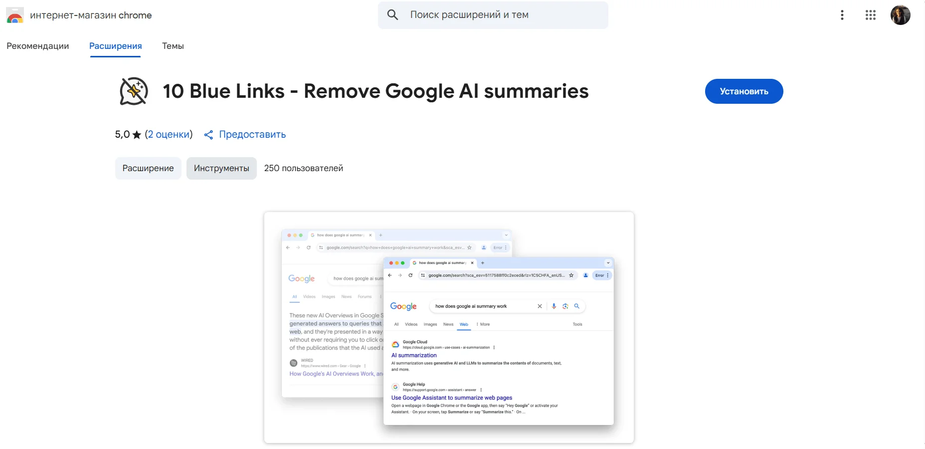 Если не хочется настраивать поиск вручную, можно поставить расширение. Оно будет автоматически скрывать «Обзор от ИИ». Вот несколько неплохих инструментов: