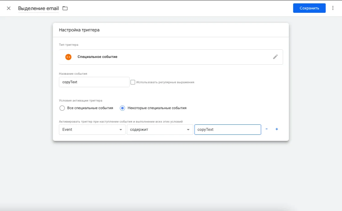 После этого создаём ещё один триггер — для отслеживания копирования email — по аналогии. Выбираем тип триггера «Специальное события», в названии события указываем «copyText», ставим галочку «Некоторые специальные события» и условие: «Event содержит copyText». Нажимаем «Сохранить».