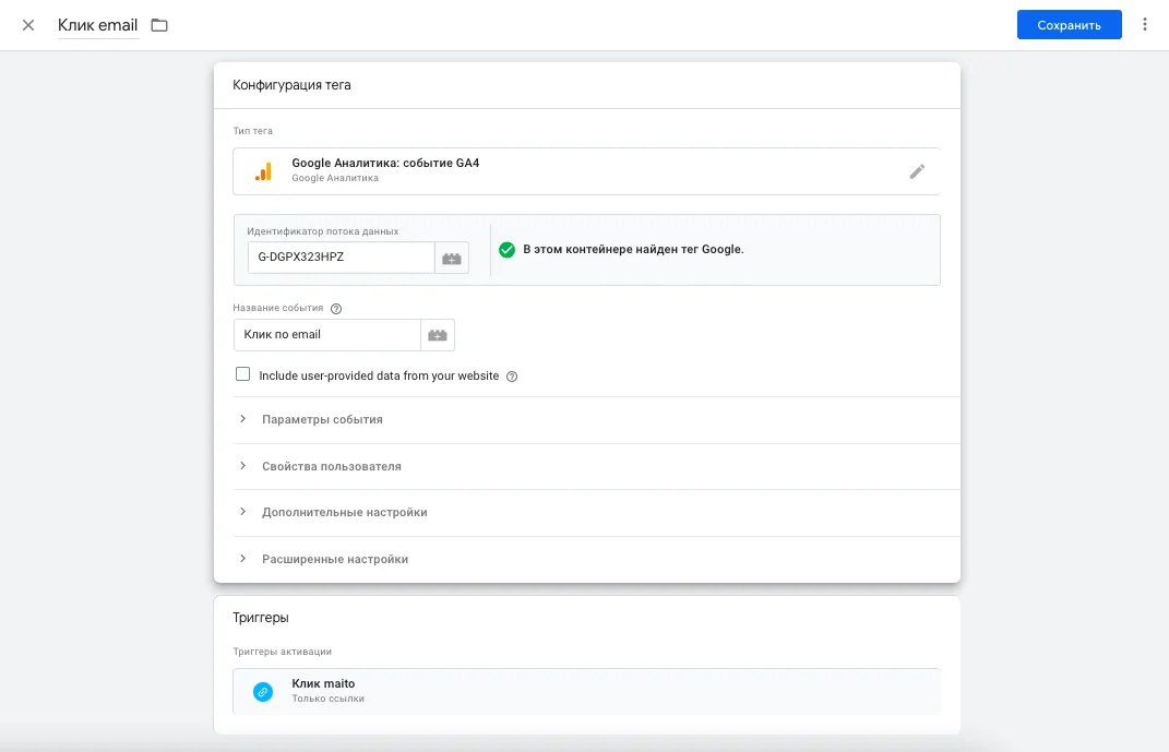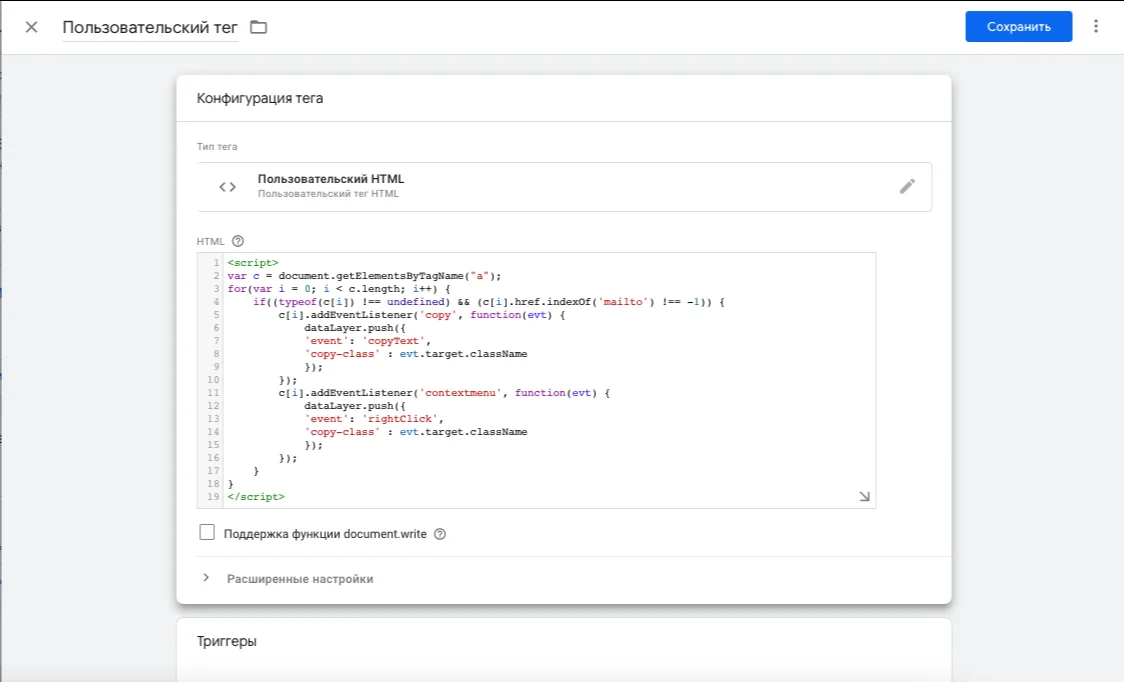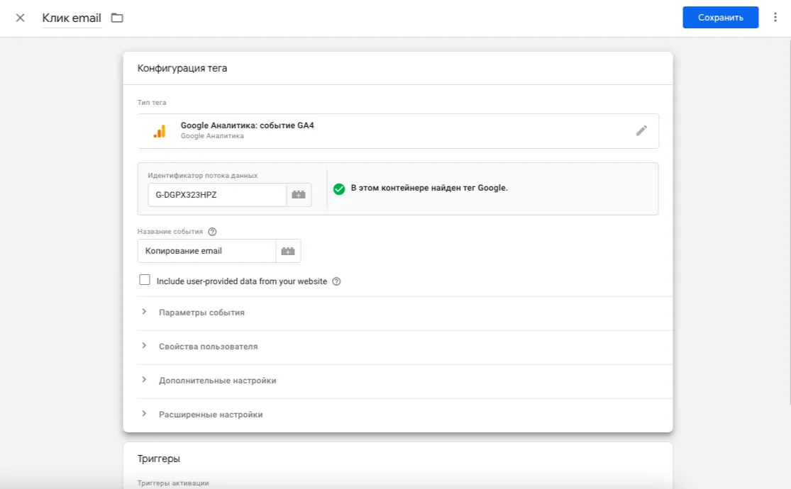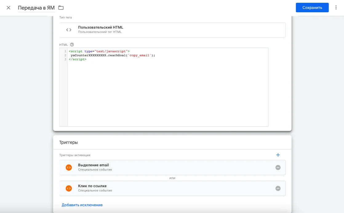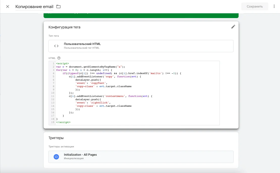 Ниже в блоке «Триггеры» выбираете два ранее созданных триггера — «Выделение email» и «Клик по email». Нажимаете кнопку «Сохранить».