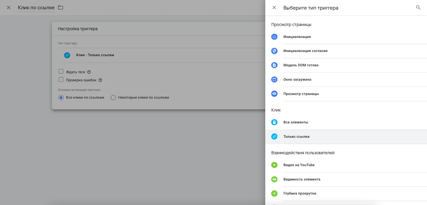 В нижней части окна добавляем триггер. Выбираем тип триггера «Только ссылки», задаём ему понятное имя.