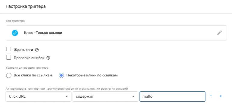 В настройках триггера выбираем «Некоторые клики по ссылкам». Задаём условие «Click URL содержит mailto». Либо можно указать конкретный электронный адрес.