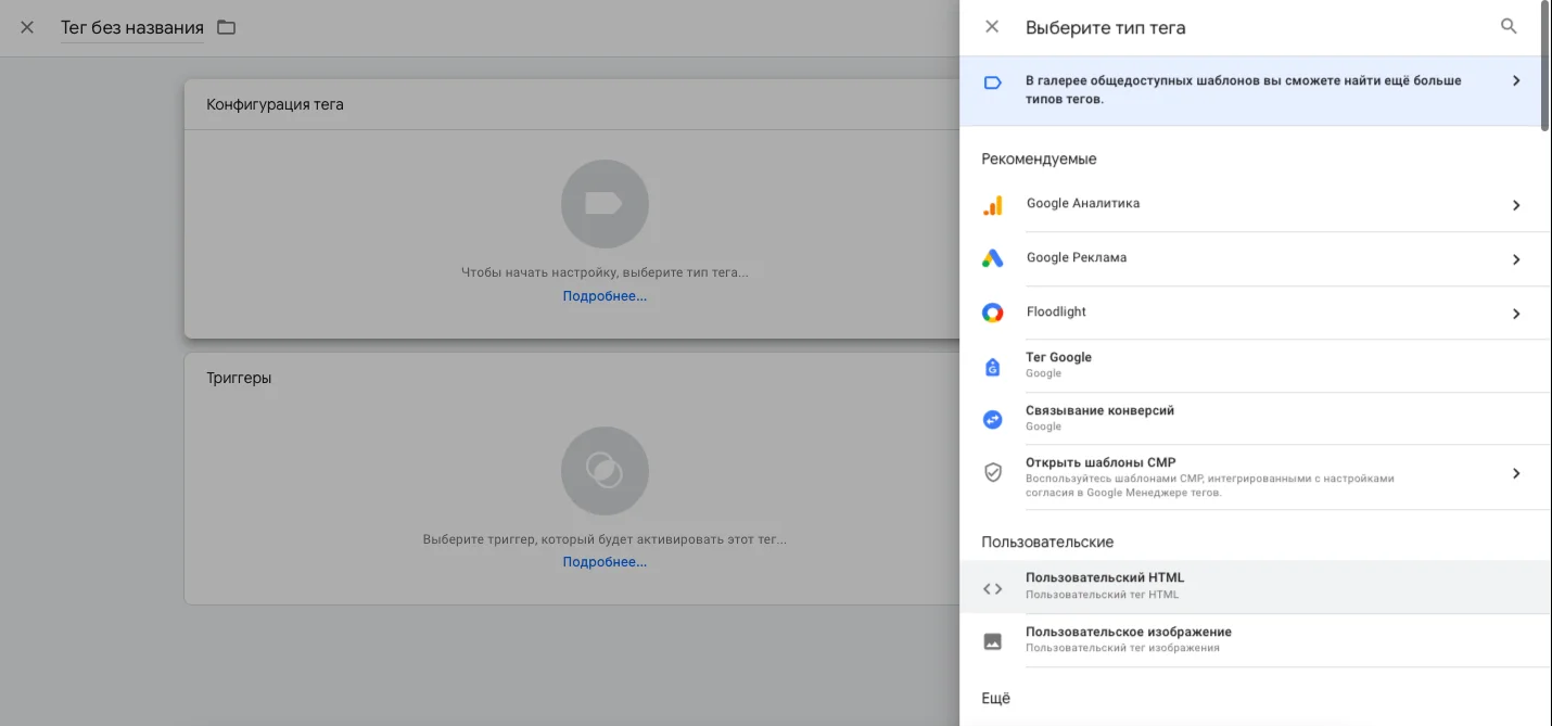 В разделе «Теги» создаем новый тег. Тип тега выбираем «Пользовательский HTML». В конфигурации тега в пустую область вставляем следующий код: