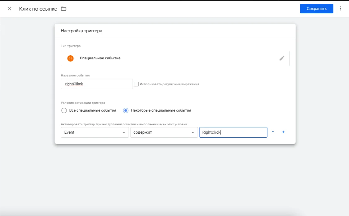 В появившемся окне пишем понятное имя триггера, например «Клик по ссылке» и в поле «Настройка триггера» выбираем тип триггера — «Специальное событие». Пишем название события — rightClick, ставим галочку «Некоторые специальные события» и добавляем условие: «Event содержит RightClick». Нажимаем кнопку «Сохранить».