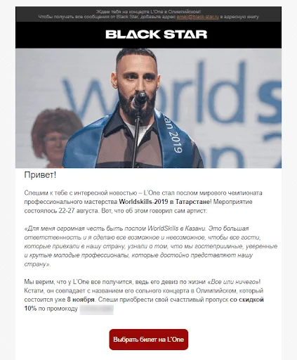 У лейбла Black Star были лендинги по каждому артисту и городу, где тот будет выступать, то есть подписчики сразу сегментировались по определенным базам — очень удобно.