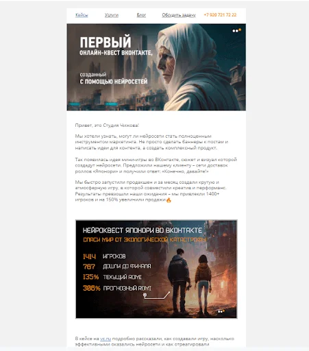 По этому направлению мы создаем и ведем рассылку материалов нашего медиа. Делимся пользой: статьями, которые рассказывают о нашей работе и нише SMM, проектами и кейсами, трендами и исследованиями. Цель — сделать главную рассылку для директоров по маркетингу в РФ, построить систему постоянного взаимодействия. Базу планируем собирать с помощью спецпроектов, один из них — руководство «Стратегия 2023».