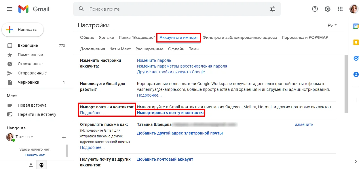Далее перейдите в раздел «Аккаунты и импорт» и в блоке «Импорт почты и контактов» нажмите «Импортировать почту и контакты».