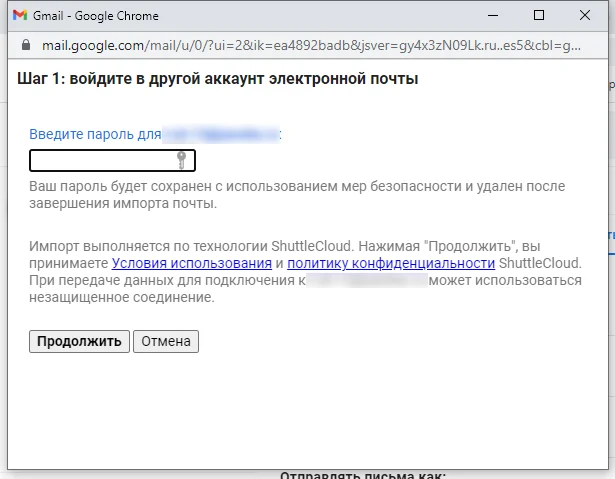 Во всплывающем окне введите адрес и пароль почты, из которой нужно перенести письма. Далее выберите, что именно вы хотите импортировать: письма, контакты, все входящие в последующие 30 дней.