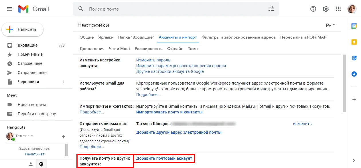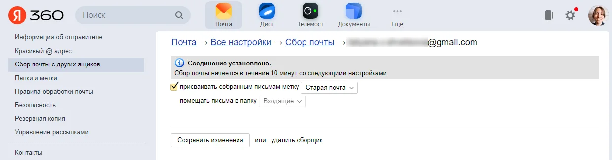 Через некоторое время после привязки письма со старого ящика отобразятся в интерфейсе Gmail. Отключить привязанный аккаунт можно в любой момент в настройках.