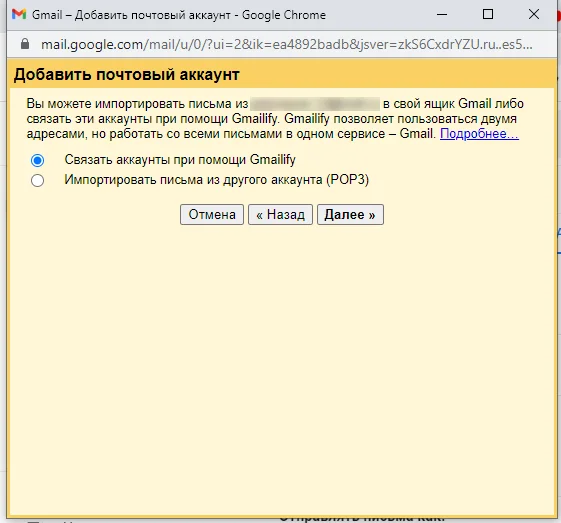 Во всплывающем окне введите адрес почты, которую нужно добавить, и выберите режим доступа. «Связать аккаунты при помощи Gmailify» — это IMAP-доступ, «Импортировать письма из другого аккаунта» — это POP-доступ. Выбор зависит от того, каким режимом пользуется сервис, с которого вы переносите почту. Крупные почтовики вроде Mail.ru и Яндекс.Почты используют сразу два режима. Если переносите почту с них, выбирайте любой.