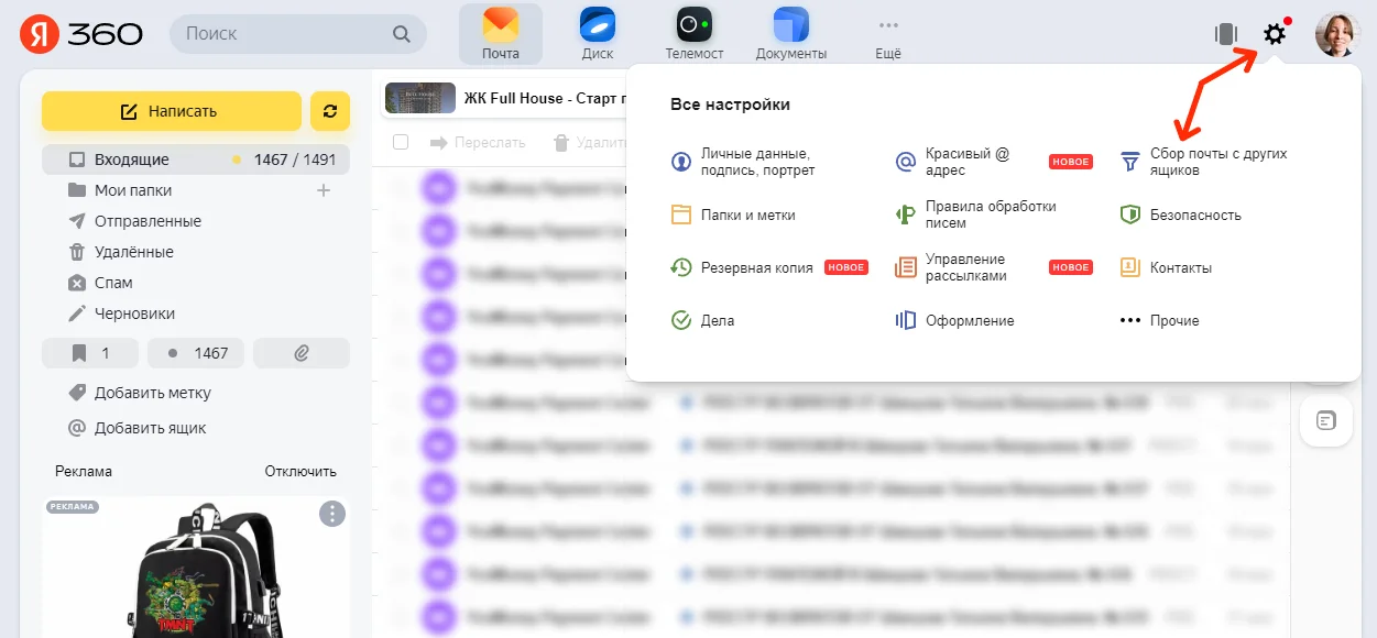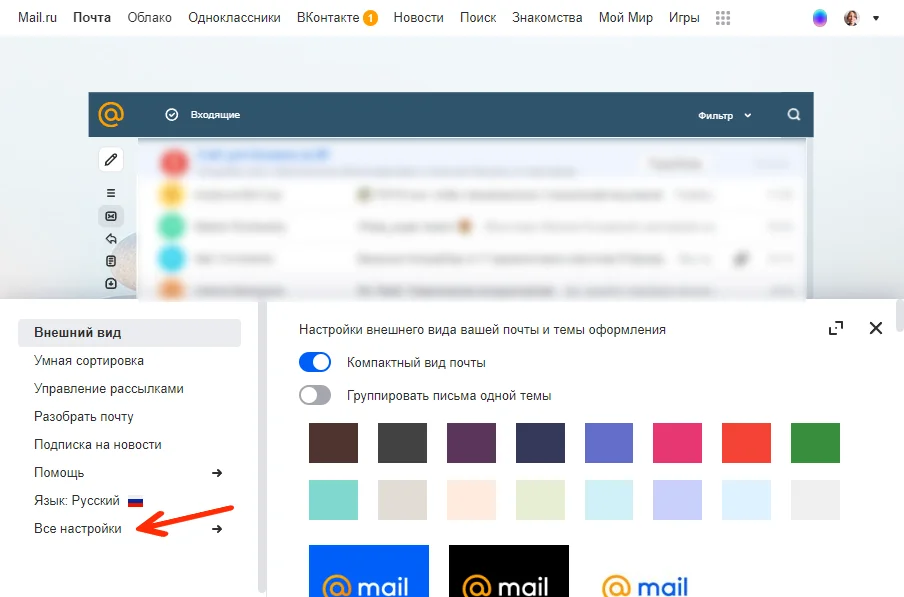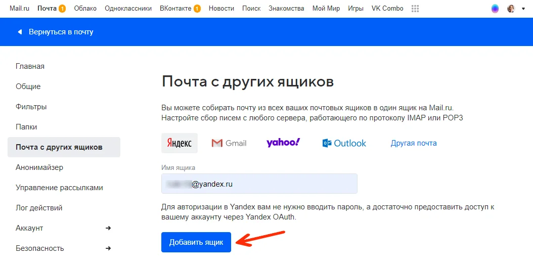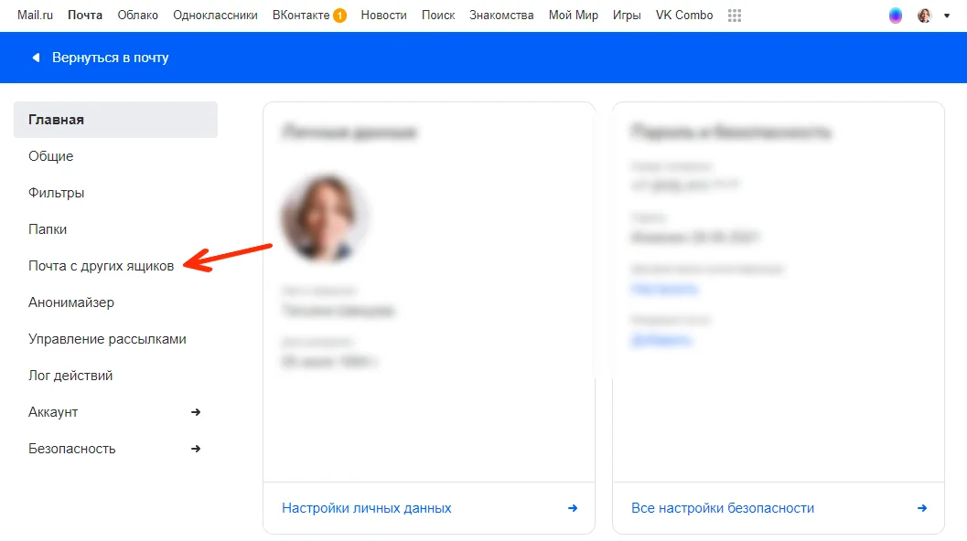 В открывшемся окошке выберите пункт «Все настройки», а затем — «Почта с других ящиков».
