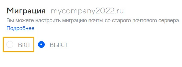 Сначала подключите свой домен к VK WorkMail. Затем перейдите в раздел «Почта» → «Миграция» и нажмите на «ВКЛ».