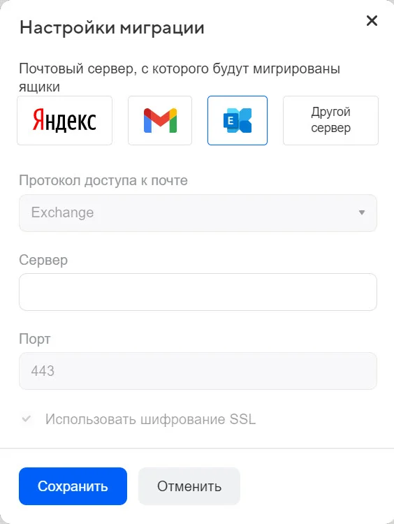 Затем выберите или укажите вручную почтовый сервис, с которого будете переносить почтовые ящики и нажмите «Сохранить».