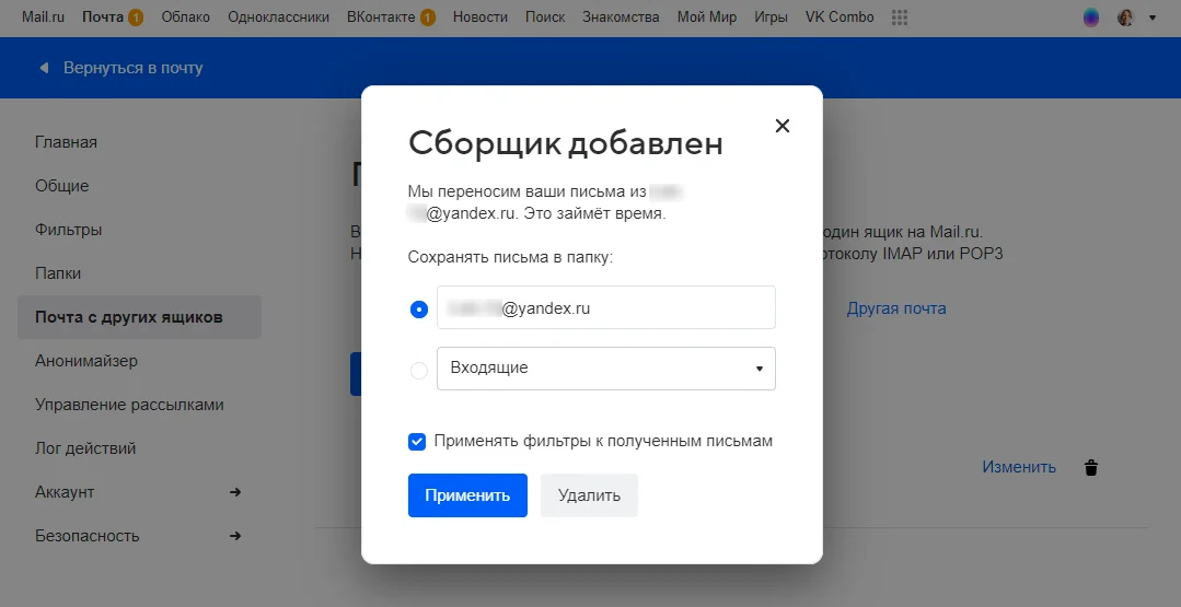 Через некоторое время письма из другой почты отобразятся в интерфейсе Mail.ru — во входящих или в отдельной папке, в зависимости от ваших настроек. Если позже вы захотите изменить настройки или отключить сбор почты, сделать это можно в том же разделе — «Почта с других ящиков».