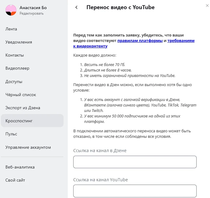 Это можно сделать через личный кабинет Дзена, однако это можно сделать не всем, потому что в Дзене есть существенные ограничения на перенос видео с YouTube: