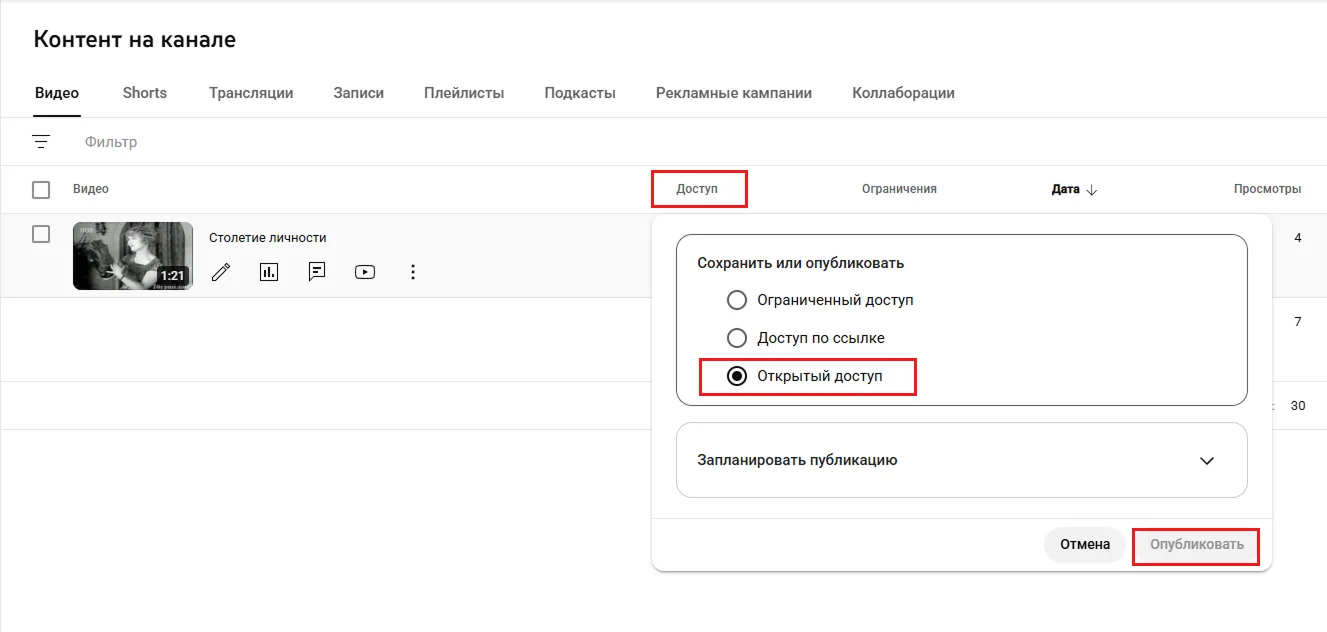 Заранее откройте доступ к нужным видео ― не получится перенести ролики с ограниченным доступом или доступом по ссылке. Это можно сделать в «Творческой студии YouTube» — в разделе «Контент».