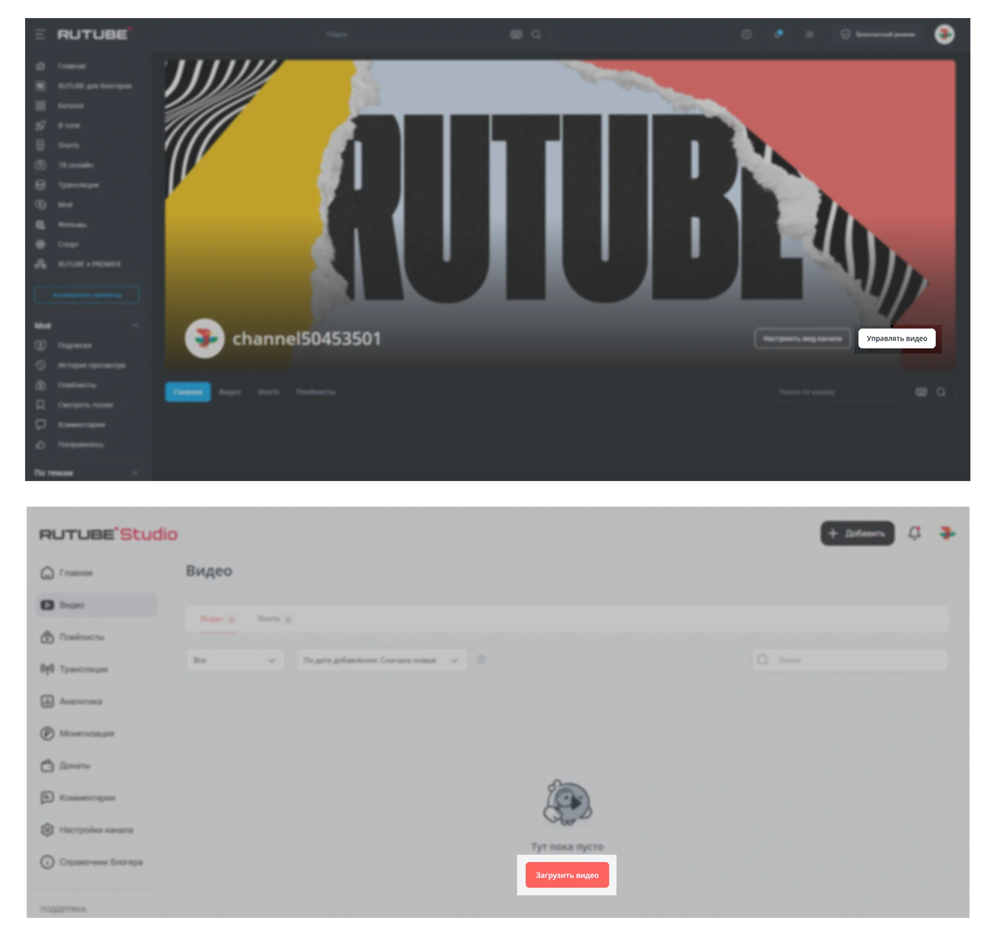 1. Зайдите на главную страницу канала на Rutube и нажмите на кнопку «Управлять видео».