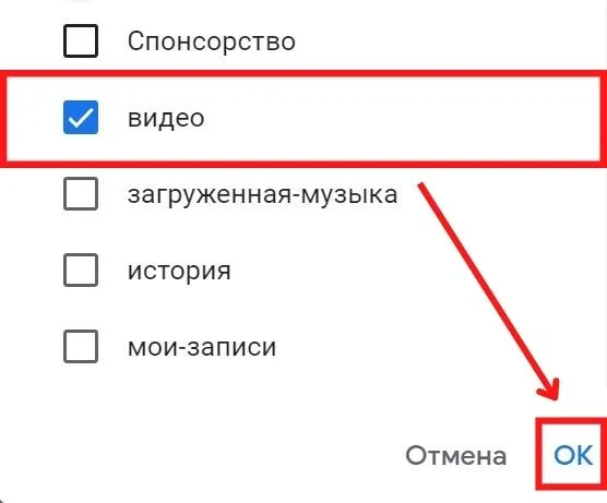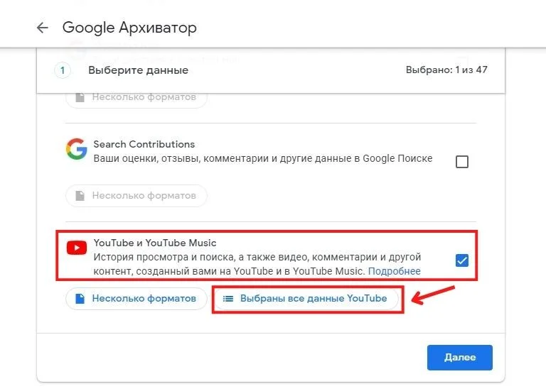 Найдите в списке «YouTube и YouTube Music» и поставьте галочку. Другие пункты отмечать не нужно. Нажмите «Выбраны все данные YouTube».