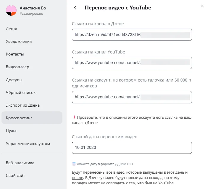 Перенос видео с YouTube находится в настройках канала в разделе «Кросспостинг».
