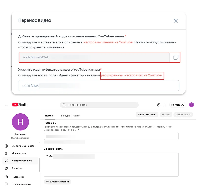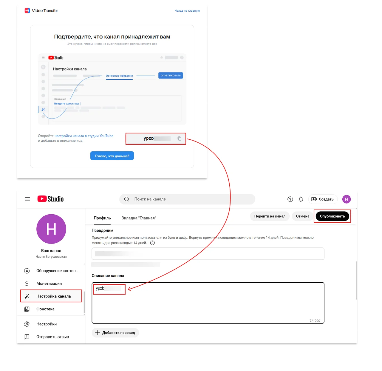 5. Теперь нужно подтвердить, что вы владеете YouTube-каналом. Для этого скопируйте проверочный код и вставьте в описание канала в «Творческой студии» YouTube. Затем нажмите «Опубликовать».