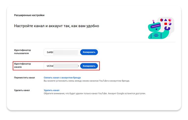 7. Скопируйте идентификатор канала, нажав на кнопку «Копировать». Вернитесь в Rutube и вставьте код в нужную строку.