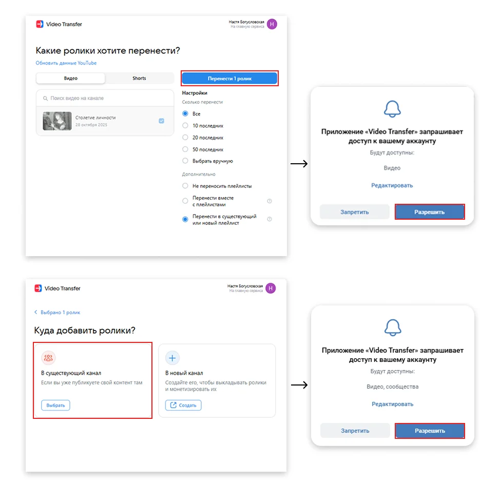 6. Выделите нужные видео вручную (не больше 1000) или выберите один из предлагаемых вариантов, и нажмите «Перенести». Затем в высветившемся окне ― «Разрешить».