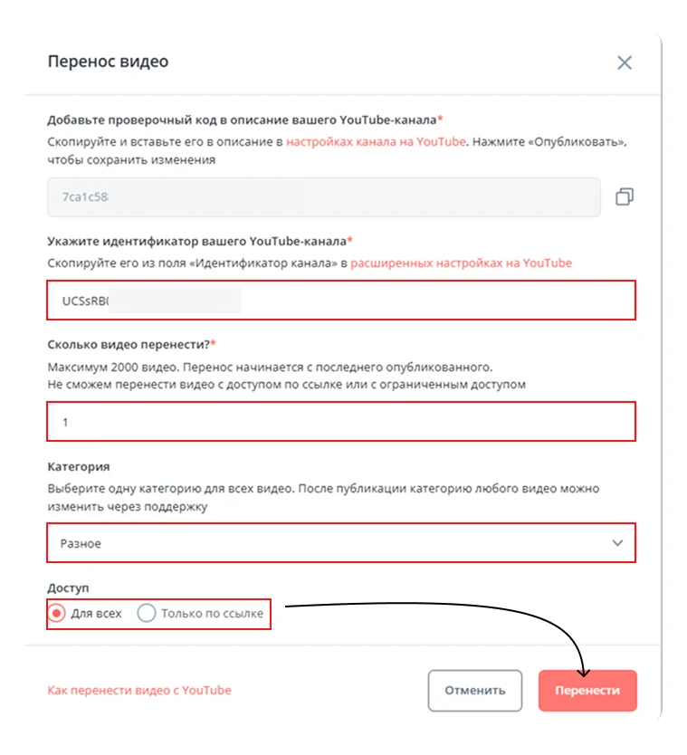 8. Дальше в окне выберите, сколько видео хотите перенести, в какую категорию, с каким доступом. Затем нажмите «Перенести».