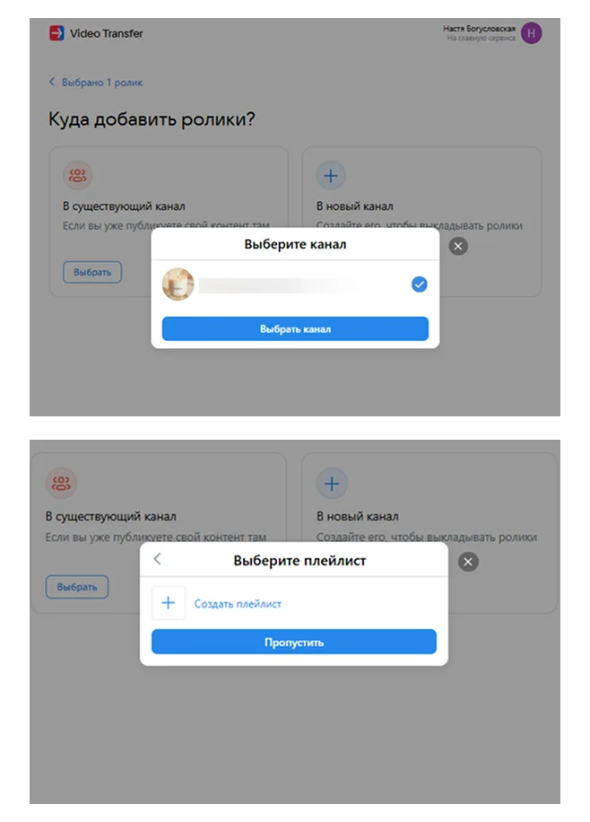 8. Выберите канал, в который хотите перенести видео. В следующем окне вы можете создать плейлист для видео, но это необязательно.