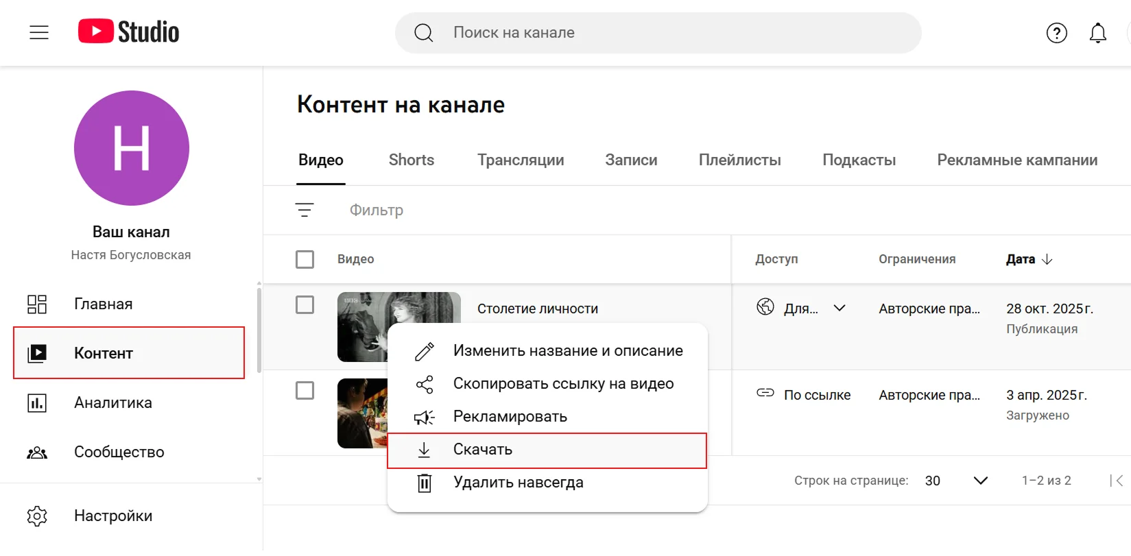 Откройте «Творческую студию YouTube», нажав на аватарку канала, или перейдите по этой ссылке. Откройте раздел «Контент» → наведите курсор на название ролика → нажмите троеточие → «Скачать».