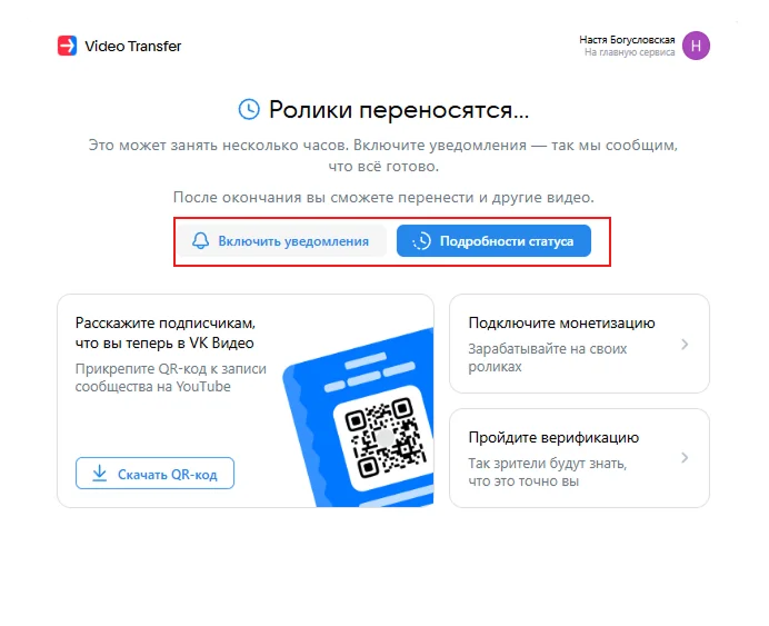 9. Ждём, когда видео перенесутся. Можно нажать «Включить уведомления» и дать разрешение на получение уведомлений, чтобы Video Transfer подсказал, когда завершит перенос видео с YouTube. А по кнопке «Подробности статуса» виден прогресс переноса видео в процентах.