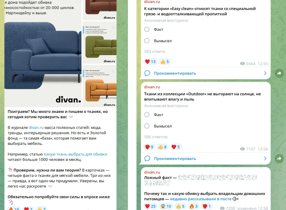 А ещё можно устроить интерактив — именно так сделали в divan.ru. Письмо с поиском одного ложного факта об обивке мягкой мебели превратилось в серию постов с опросами.