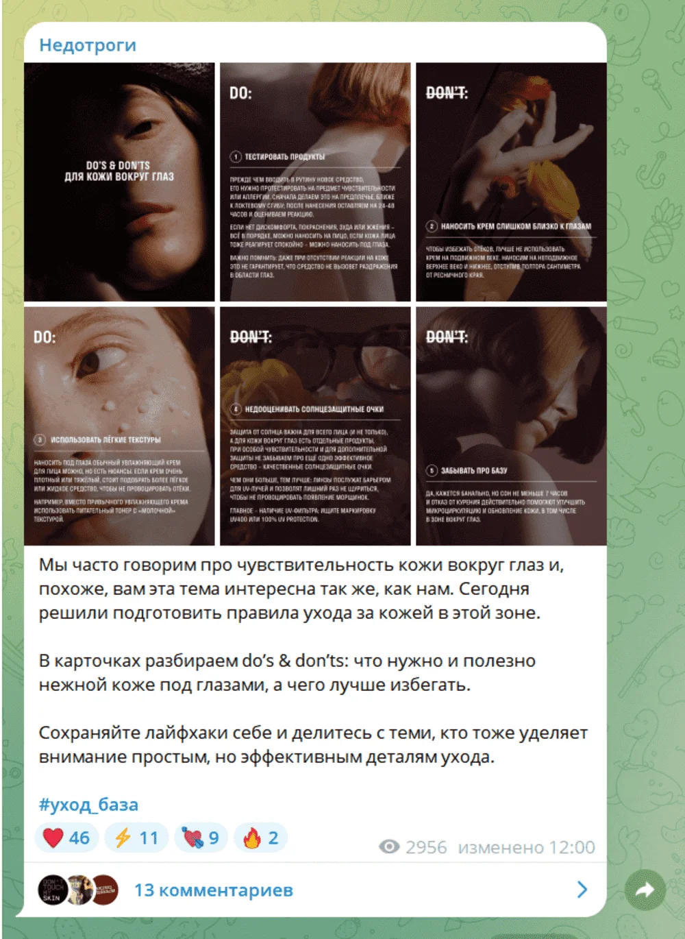 Так делает косметический бренд Don't touch my skin: контентные рассылки с рассказами о том, как пользоваться разными видами кремов, переупаковываются в карточки для соцсетей. При этом контент не просто дублируется, а дополняется, поэтому даже если пользователь подписан на оба канала, повтор не будет бросаться в глаза.