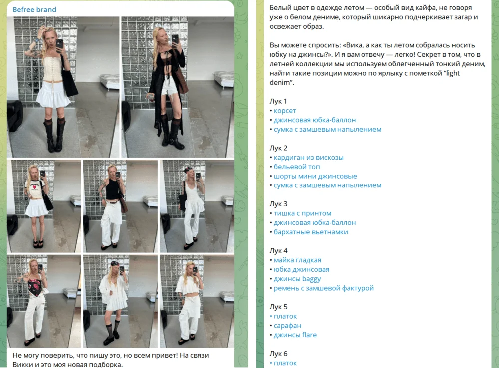 Например, бренд одежды Befree в рассылке ведёт рубрику с подборкой образов от стилиста. В рассылке — 3 избранных образа, а в соцсетях представлена более широкая подборка из 9 образов.