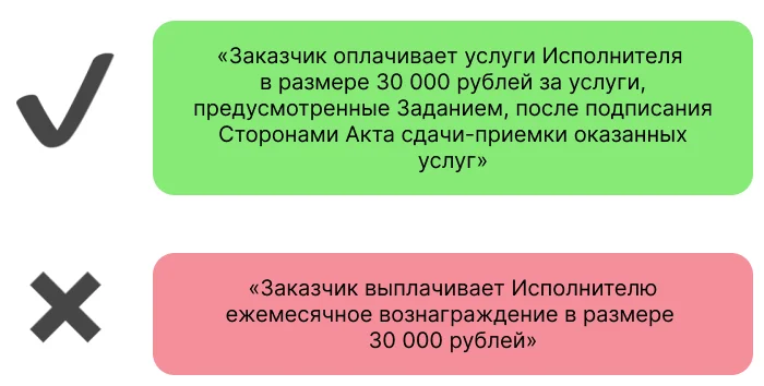 После выполнения работ обязательно подписывайте акт оказания услуг. Хотя он не является обязательным документом, акт — главное доказательство того, что работа принята, а у сторон нет претензий друг к другу. При налоговой проверке такой документ станет юридическим доказательством того, что отношения носят сдельный, а не трудовой характер.