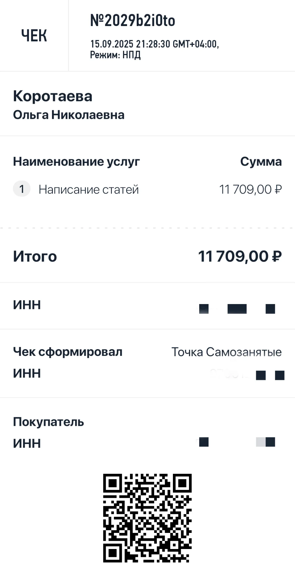 Чек — ещё один обязательный документ при сотрудничестве с плательщиками НПД. Его должен формировать самозанятый через приложение «Мой налог» и отправлять вам до 9 числа следующего месяца.