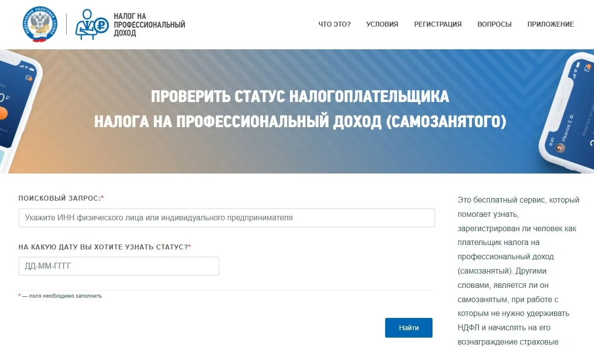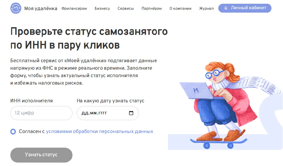 Через бесплатный сервис от «Моей удалёнки». Данные подтягиваются напрямую из налоговой. Достаточно указать ИНН физлица и дату проверки — и вы сразу получите результат на той же странице.