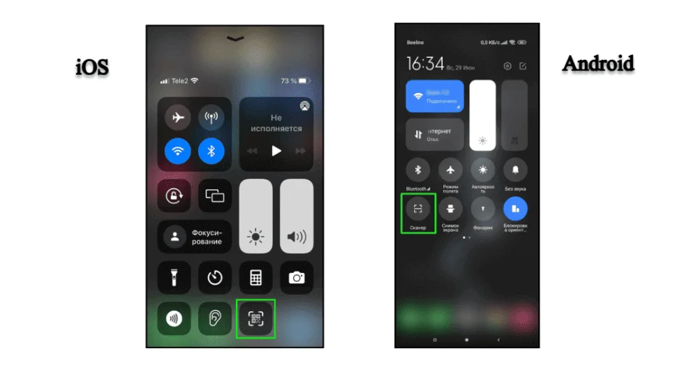 Иногда удобнее использовать встроенный сканер, который есть на большинстве современных смартфонов. Находится он на панели быстрых настроек («шторка» уведомлений). Функция одинаково работает и на iOS, и на Android. Вот как это сделать: