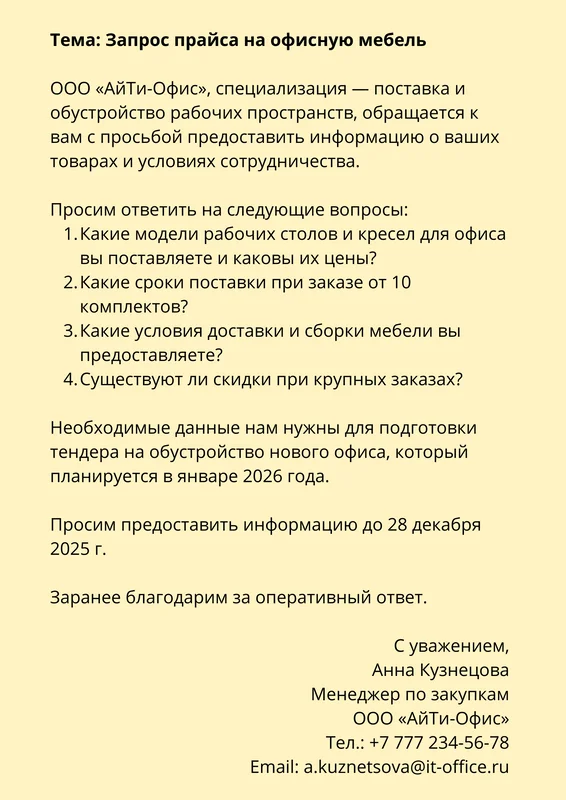Пример письма для запроса коммерческого предложения: