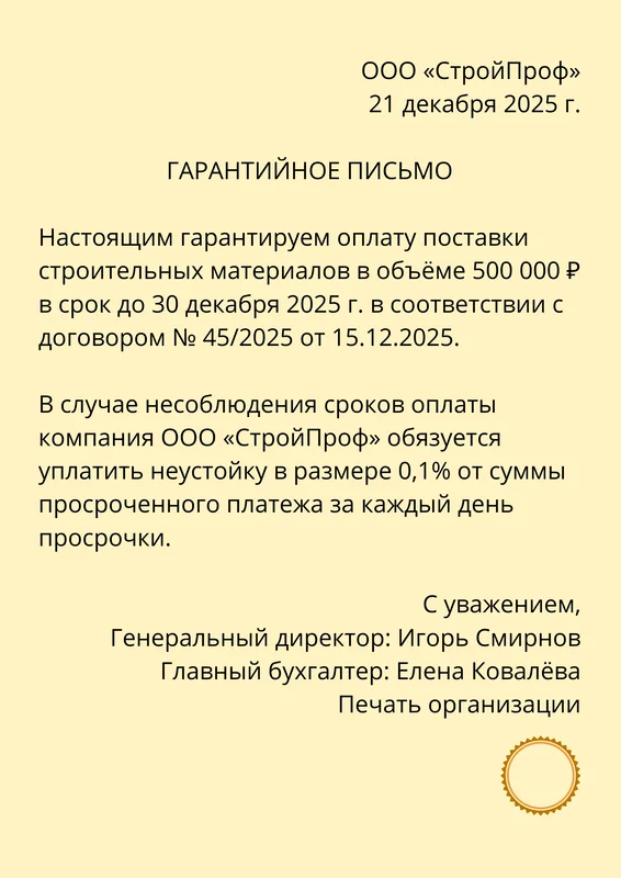 Пример гарантийного письма: