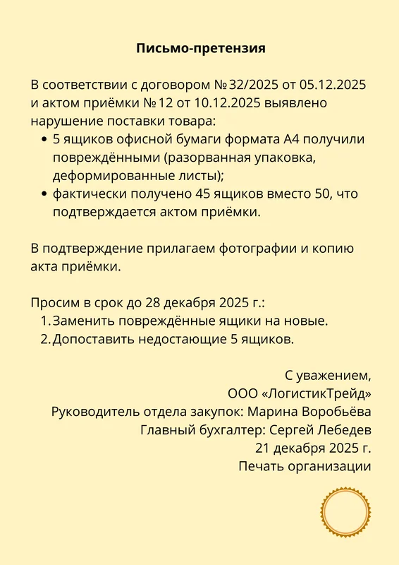 Пример письма-претензии: