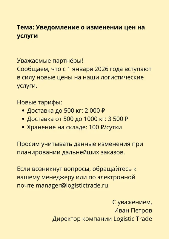 Информационные. Уведомляют о фактах. К примеру, о смене реквизитов, изменении цен, графике работы или назначении ответственного менеджера.
