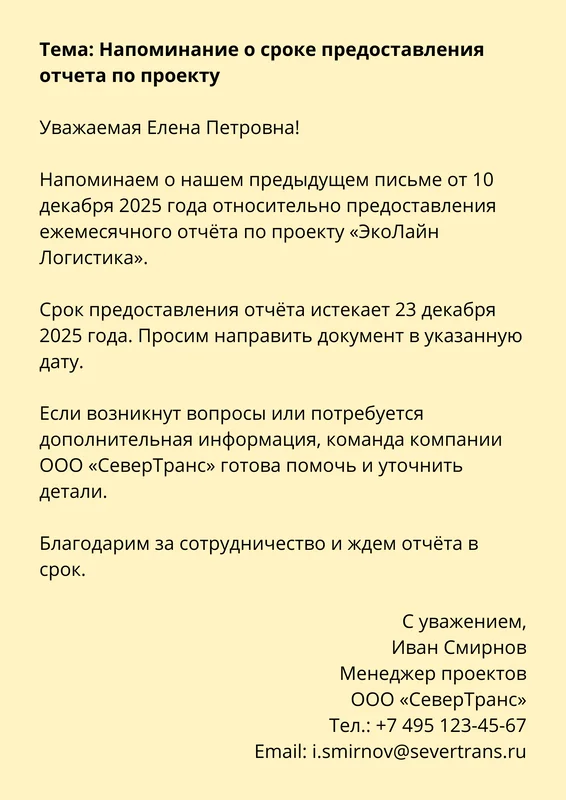 Пример письма-напоминания: