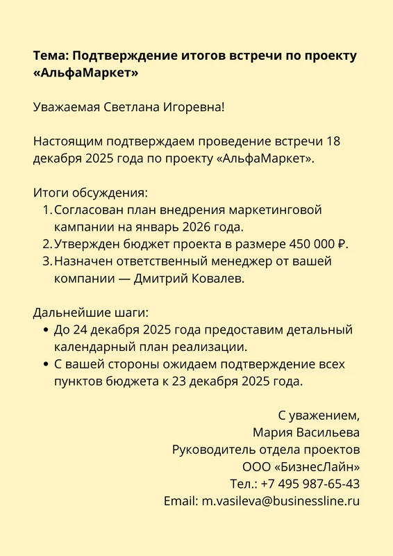 Пример письма-подтверждения:
