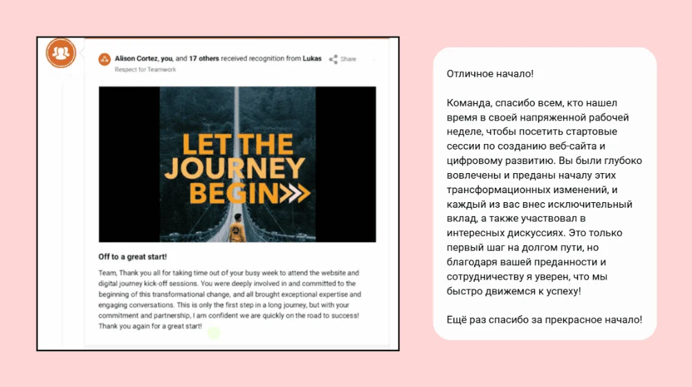 - всей команды — акцент на общих целях и ценности коллективной работы;