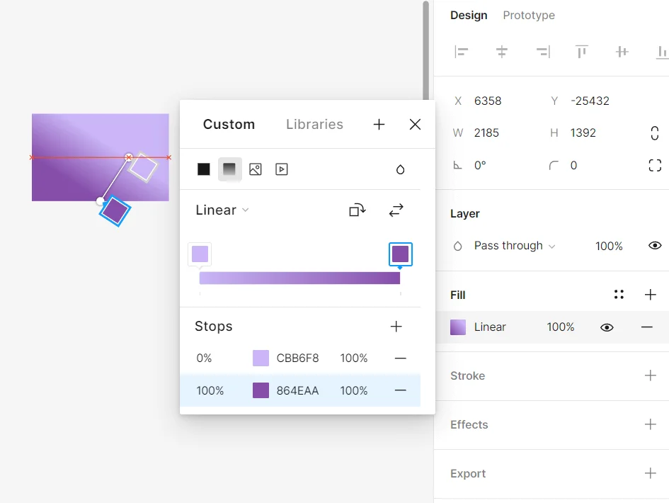 В Figma можно нарисовать фон для слайдов или изображений самостоятельно. Для этого нужно на верхней панели выбрать прямоугольник — Rectangle, а затем перейти в параметр заполнения — Fill. Дальше можно выбрать режим градиента — Linear, цвета и угол перехода.