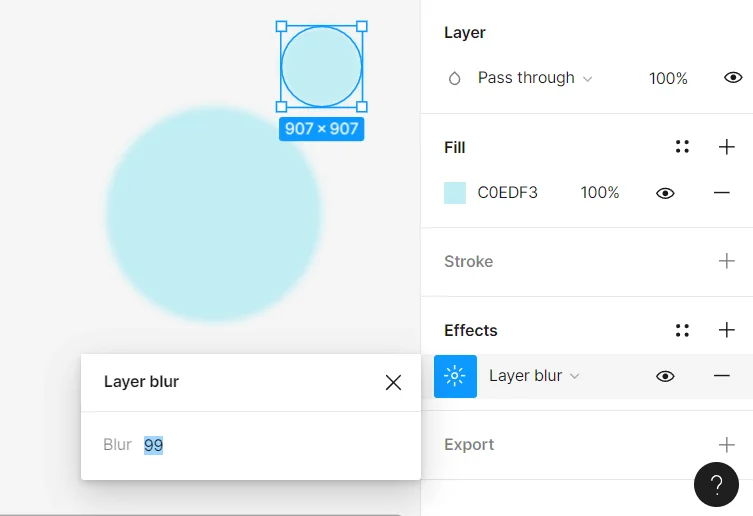 Еще один вариант — создать круг и размыть границы фигуры, а затем поставить его на фон слайда или картинки. Для этого нужно на верхней панели Figma выбрать Ellipse, зажать Shift и нарисовать круг. Затем перекрасить через Fill. Чтобы сделать границы нечеткими и создать градиент, нужно перейти в настройку эффекты — Effects и размыть слой — Layer blur.