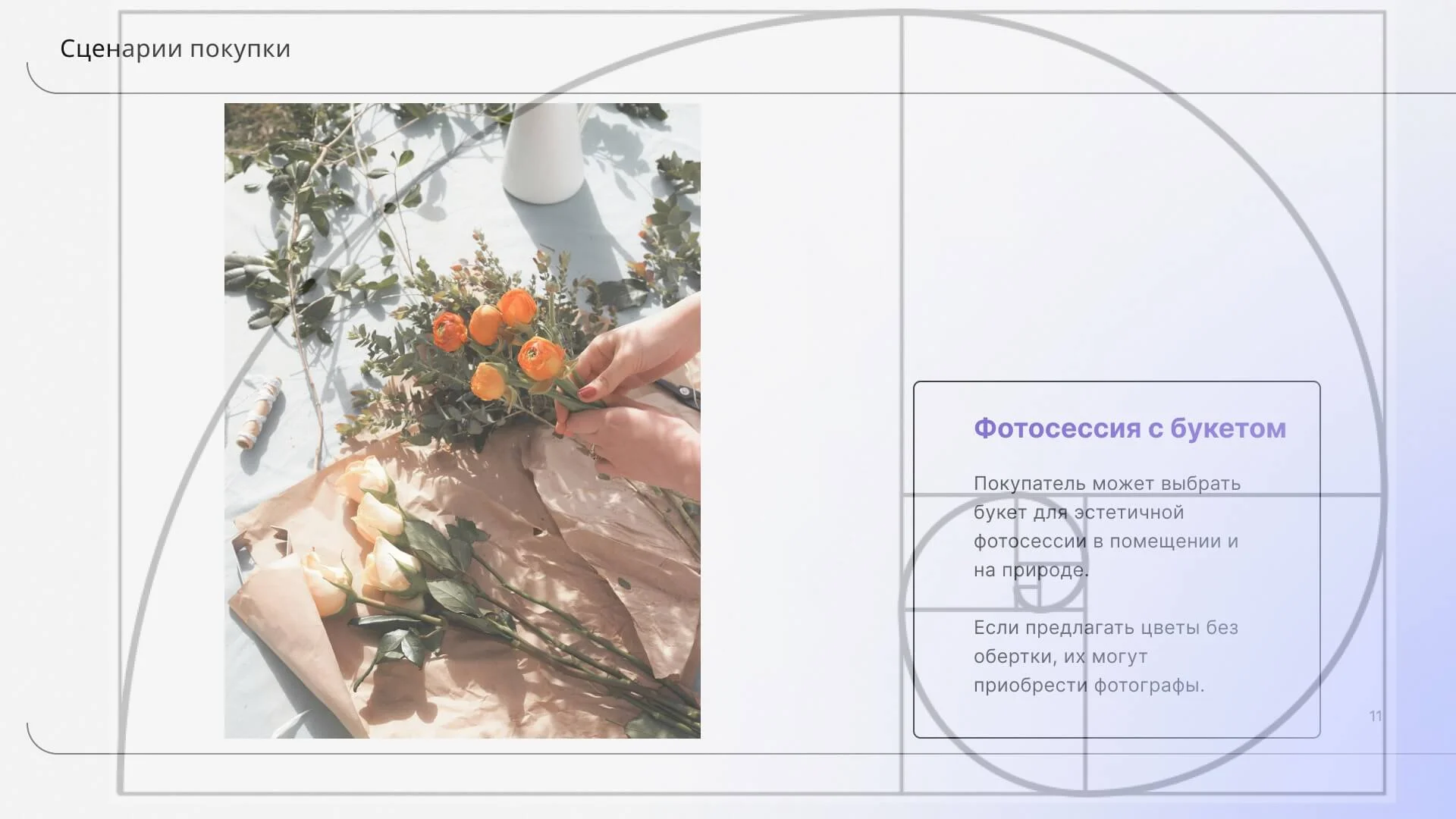 Еще один вариант — расположить элементы по правилу «золотого сечения». Тогда в одной части слайда будет несколько мелких деталей, а в другой — крупные изображения или блоки текста. Шаблон спирали можно найти в сети как картинку, а затем поставить с прозрачностью 30% поверх страницы.