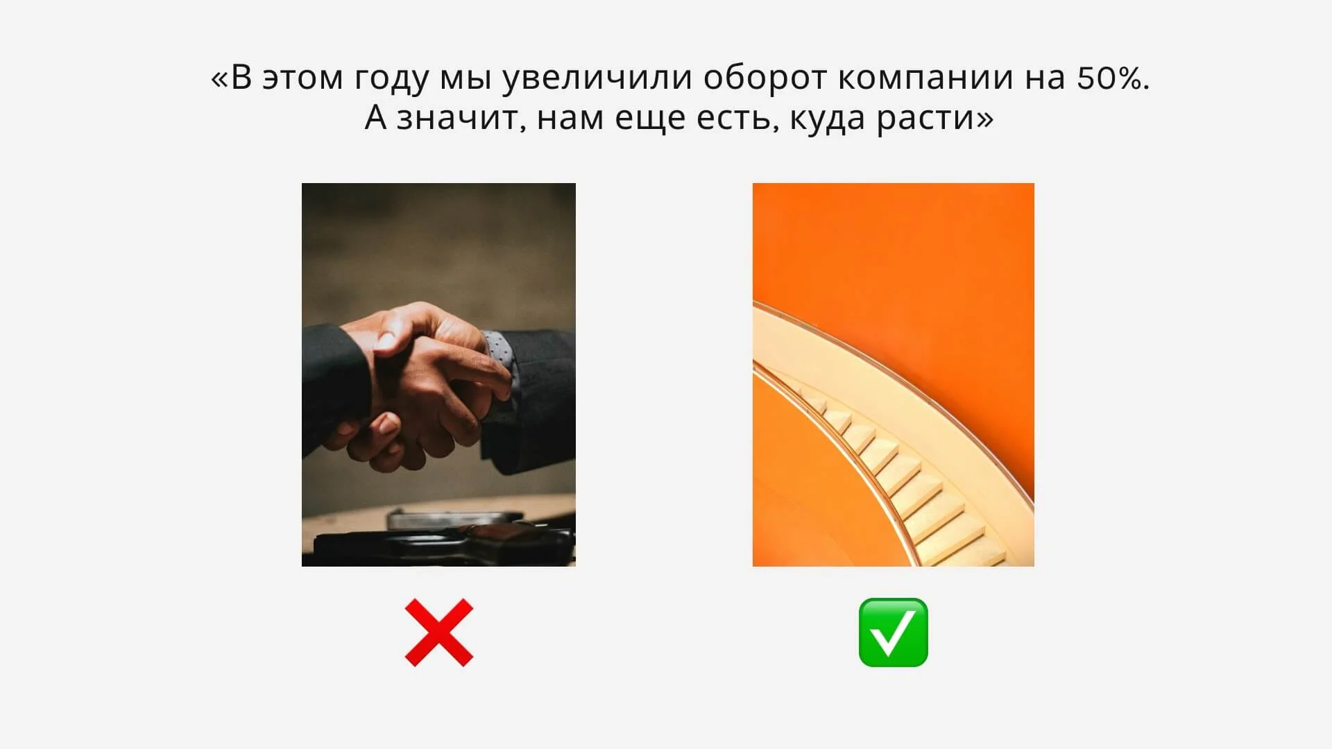 Иногда фотографии подобрать трудно — например, если у вас презентация о росте бизнеса или о юридических услугах. Но слайды можно проиллюстрировать, подобрав абстрактные кадры с образами и метафорами. От снимков, которые буквально показывают тему или процесс, лучше отказаться — они выглядят заезженными и только отвлекают зрителя.